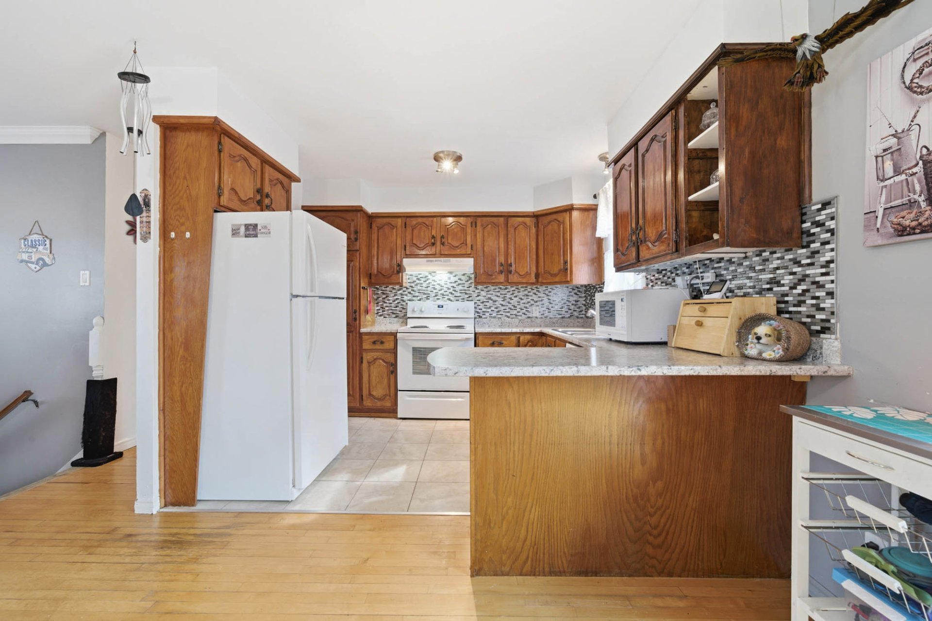 As soon as you walk in, you'll be charmed by its well-maintained open-concept layout. The spacious, bright living room flows seamlessly into a cozy dining room, creating the perfect space for entertaining. The functional kitchen, featuring a large countertop, offers a practical yet welcoming environment.