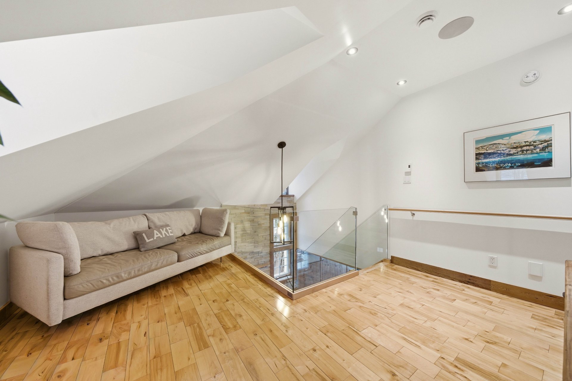 Upstairs, a second, intimate living room offers a perfect retreat for enjoying moments of tranquility. The master suite, a true sanctuary, is distinguished by its breathtaking lake views, generous proportions, and meticulously designed walk-in closet. A second, equally inviting bedroom, along with a refined bathroom featuring a separate shower, completes this floor with meticulous attention to detail.