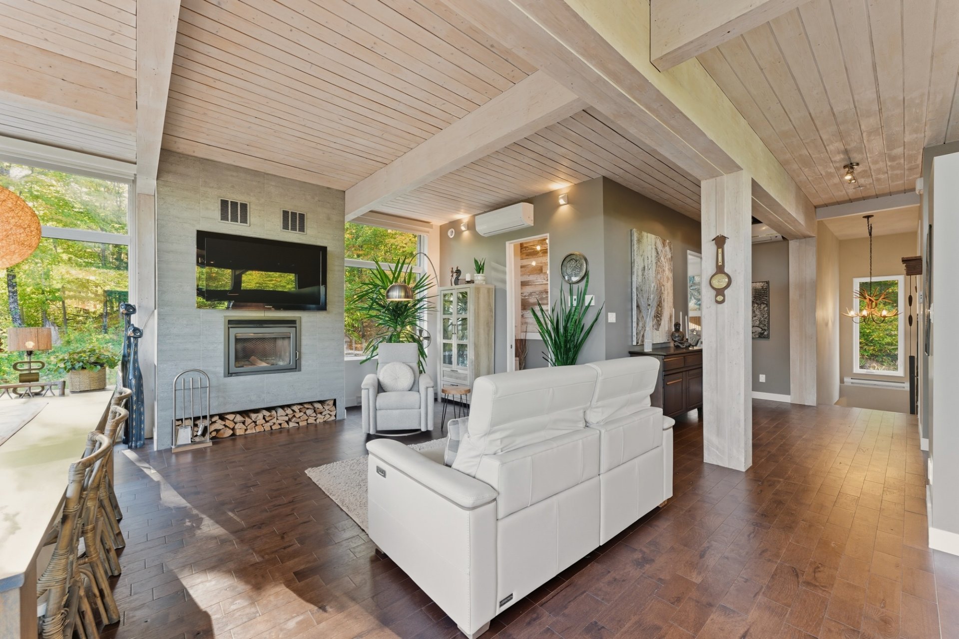 Report from a certified appraiser available upon request. Nestled in a peaceful, wooded area, this contemporary residence harmoniously blends design, comfort, and functionality in an exceptional natural setting. From the moment you enter, the abundant light, high-quality materials, and open spaces create a warm and welcoming atmosphere.