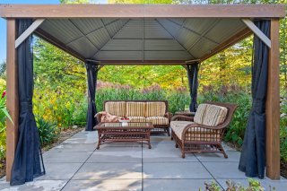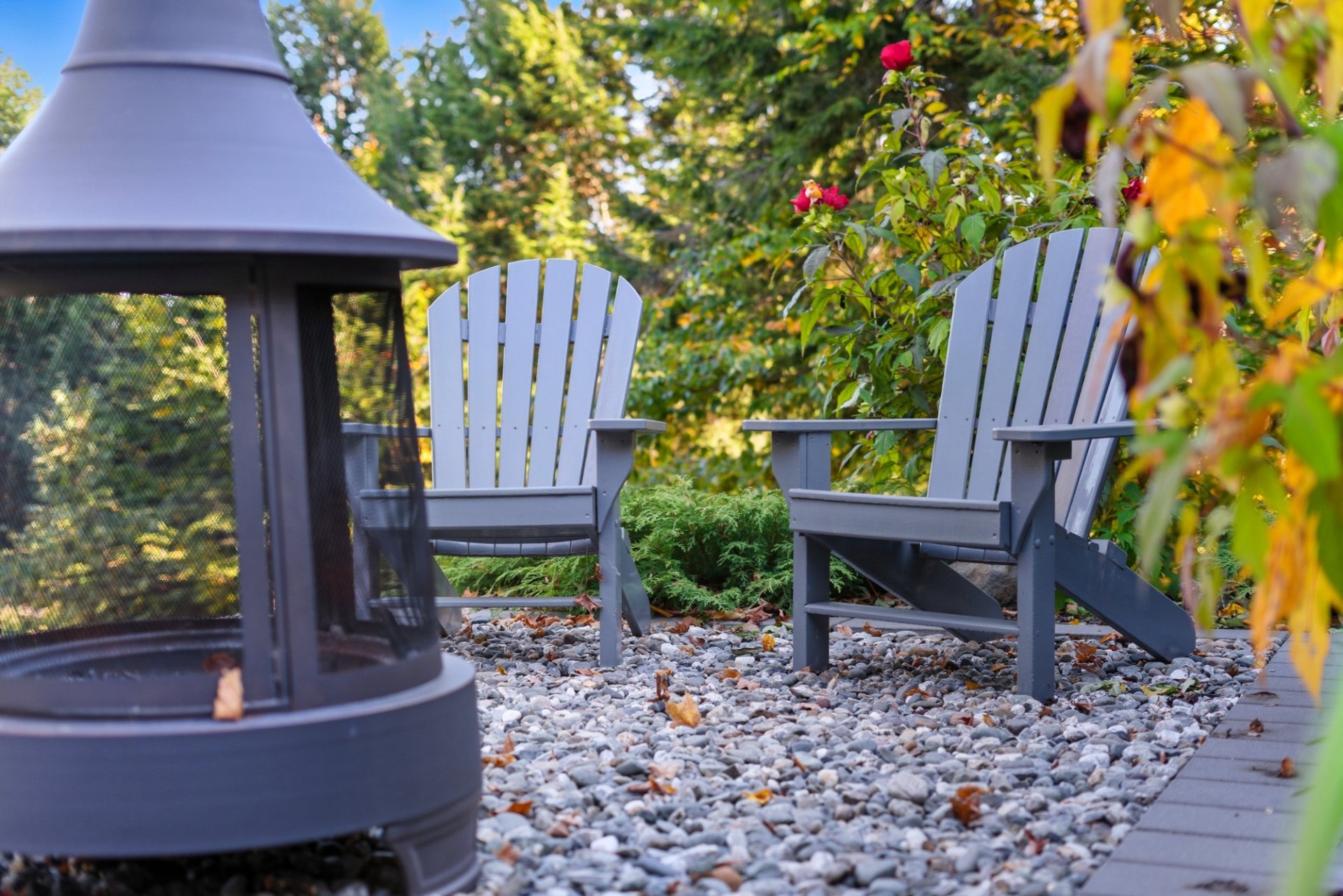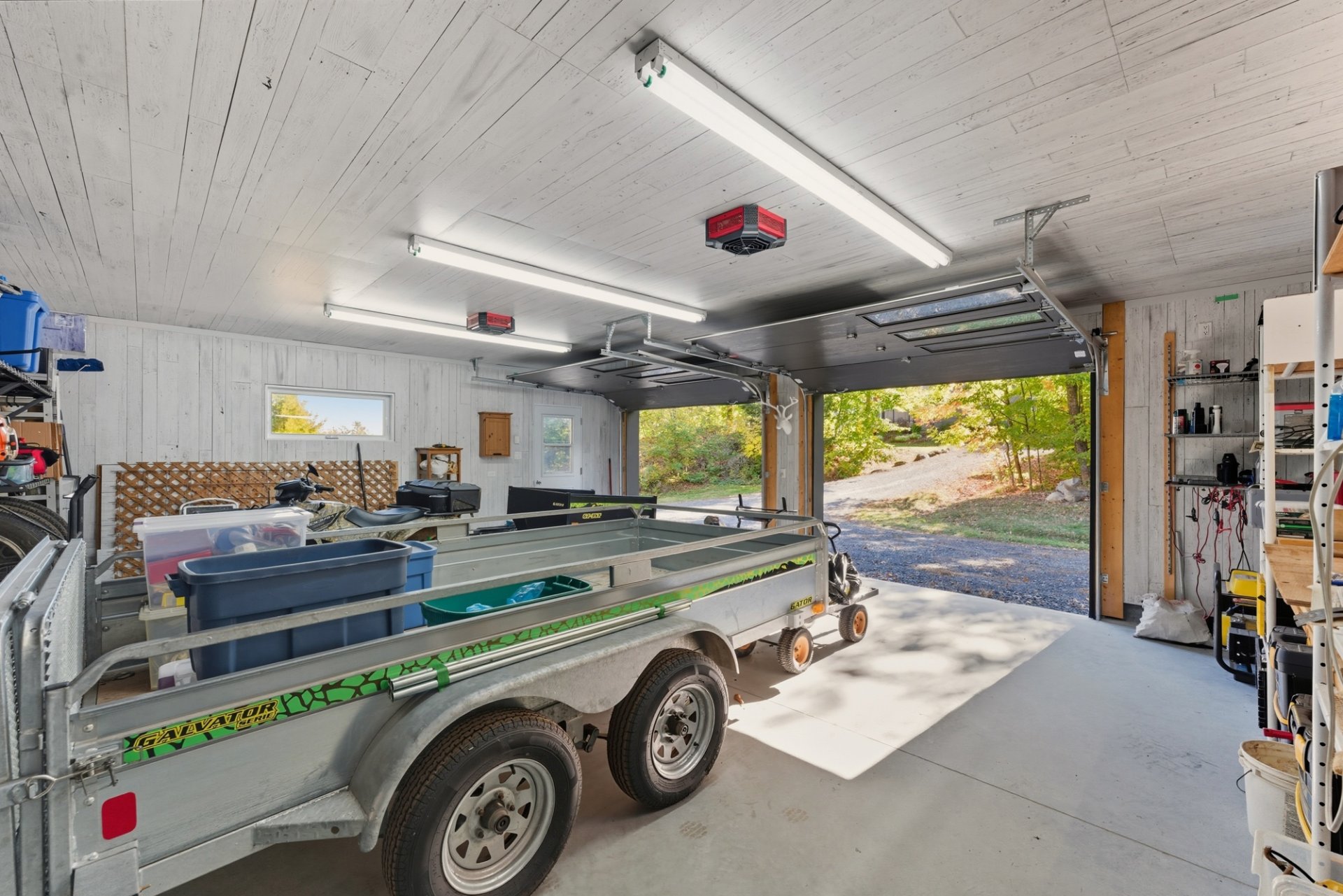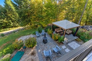 Outdoors, the recent landscaping (2022), gazebo, fire pit, garden, and multiple terraces invite relaxation. The underground electrical wiring preserves the beauty of the landscape while providing protection from the elements. A large shed combined with a wood storage area and a double heated garage add practicality and functionality.