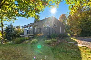 EXCEPTIONAL ESTATE OF OVER 43 ACRES. In perfect harmony with nature, this contemporary residence stands out for its brightness and comfort, thanks to its south-facing orientation and superior insulation. The open-concept layout allows a smooth flow, ideal for hosting family and friends. It features a powder room, a primary bedroom with an ensuite bathroom, and three additional bedrooms spread over the upper and garden levels. Outside, terraces, garden, gazebo, and firepit create a peaceful setting. Nearby: Lake Memphremagog, Mont-Orford, and golf courses