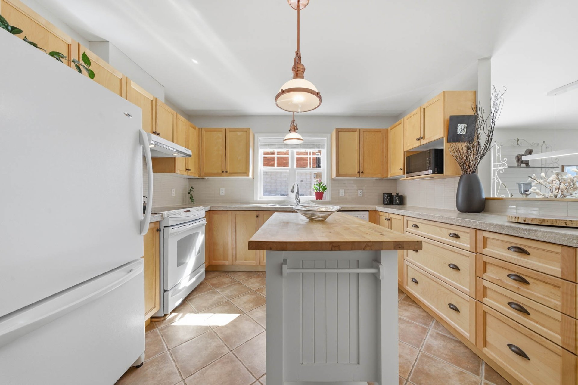 The elegantly appointed kitchen, with its wood cabinetry and central island, offers ample workspace and plenty of storage. It flows seamlessly into a dining room bathed in natural light thanks to its carefully chosen windows.