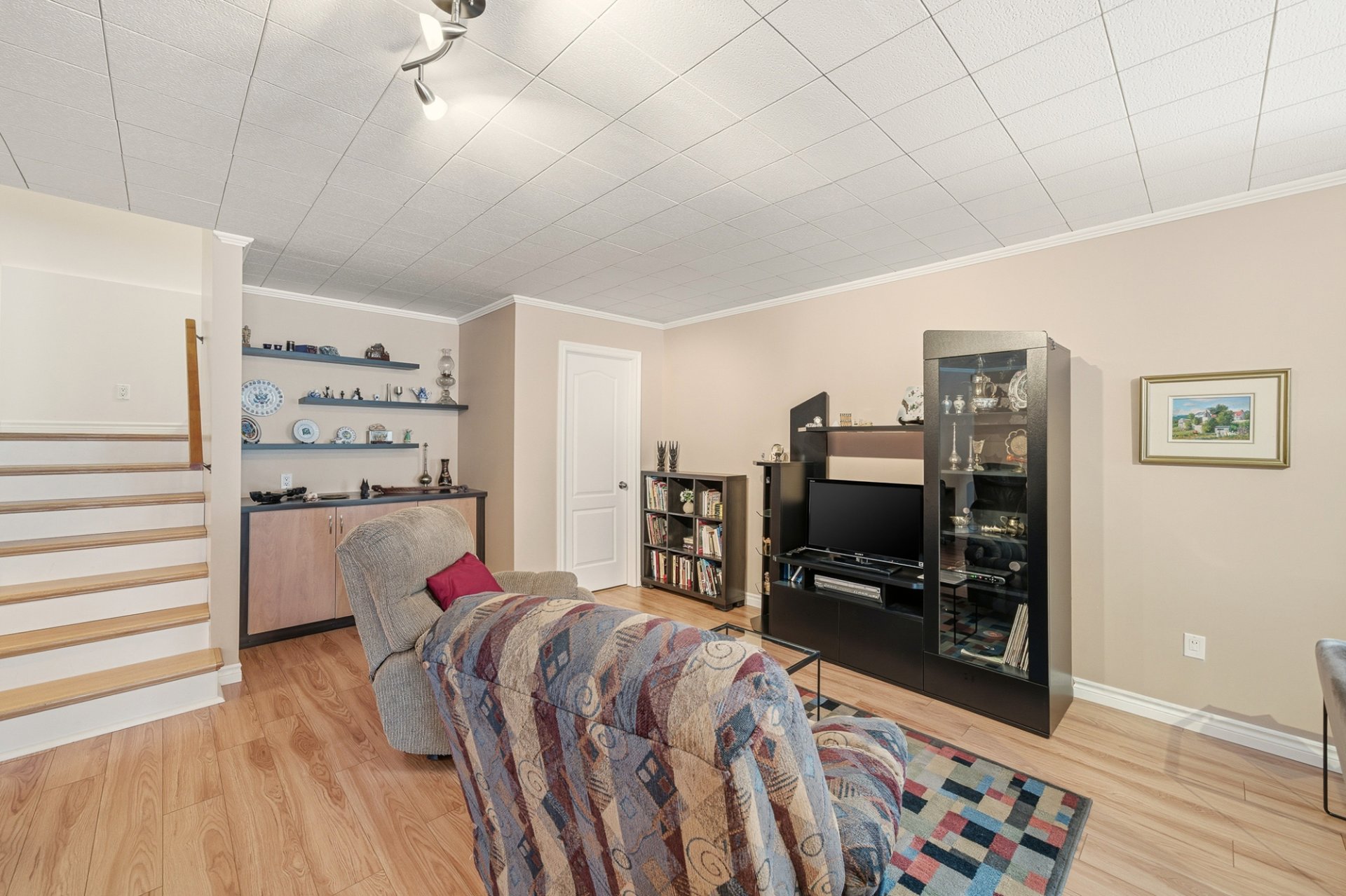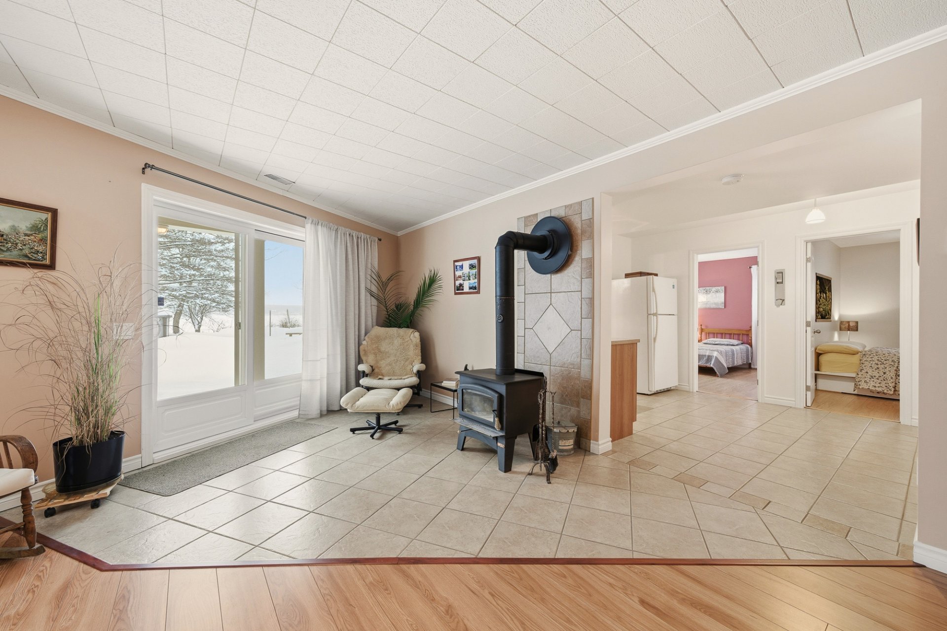 Le sous-sol entièrement aménagé dévoile une vaste salle familiale lumineuse avec poêle au bois, une cuisinette, une salle de bain et deux chambres à coucher, offrant une polyvalence remarquable.